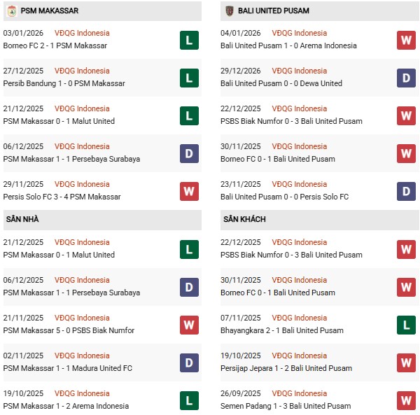 Bali United hiện xếp hạng 8 với 24 điểm, nhiều hơn chính PSM Makassar 5 điểm sau 16 vòng đấu. Đội khách sở hữu thành tích 6 thắng, 6 hòa và 4 thua, phản ánh sự cân bằng giữa công và thủ. Phong độ gần đây của Bali United khá tích cực khi thắng 5, hòa 3 và chỉ thua 2 trong 10 trận gần nhất.