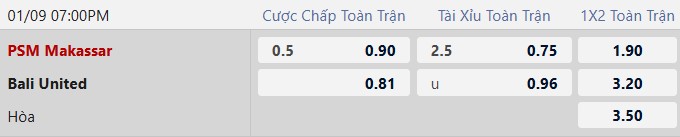 Thông tin tỷ lệ kèo PSM Makassar vs Bali United: