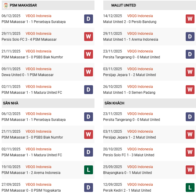 Malut United đang có điểm rơi phong độ có lẽ khiến mọi đối thủ phải dè chừng khi 8 vòng đấu liên tiếp gần đây bất bại và giành đến 6 chiến thắng. Mặt khác, 5 trận sân nhà gần nhất của PSM Makassar chỉ thắng 1, do đó có thể chủ nhà sẽ nếm trái đắng.
