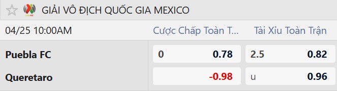 Thông tin tỷ lệ kèo Puebla vs Queretaro: