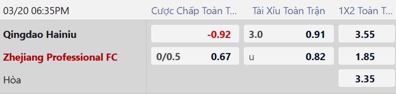 Thông tin tỷ lệ cược Qingdao Hainiu vs Zhejiang: