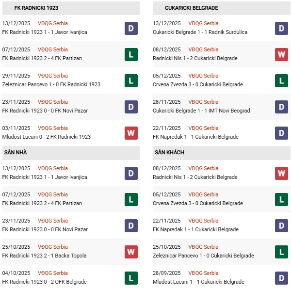 Thống kê phong độ Radnicki 1923 vs Cukaricki: