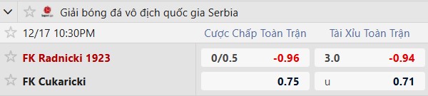 Thông tin tỷ lệ kèo Radnicki 1923 vs Cukaricki:
