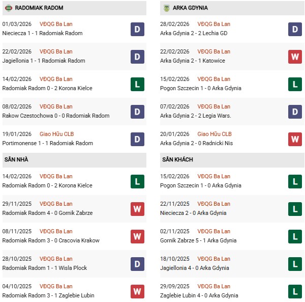 - Trên sân nhà, Radomiak thắng 1, hòa 2 trước Arka Gdynia.