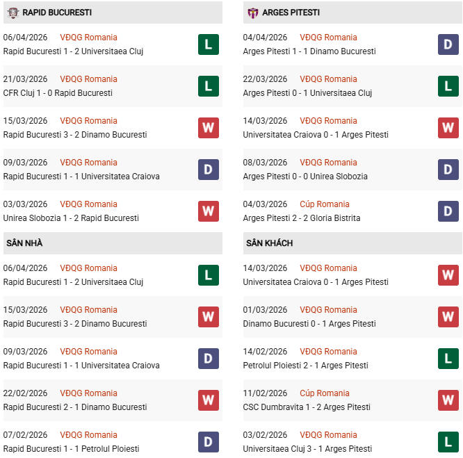 Thành tích đối đầu Rapid Bucuresti vs Arges: