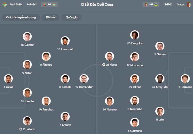 - Real Betis hòa 3, thua 1 trong 4 trận gặp Braga gần đây.