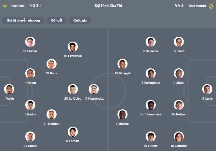 Đội hình dự kiến Real Betis vs Real Madrid: