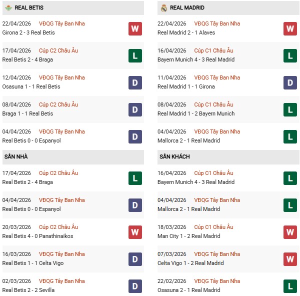 Thành tích đối đầu Real Betis vs Real Madrid: