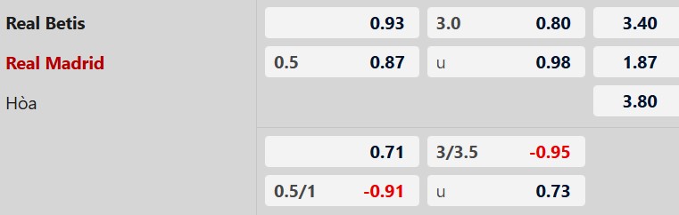 Thông tin tỷ lệ kèo bóng đá Real Betis vs Real Madrid: