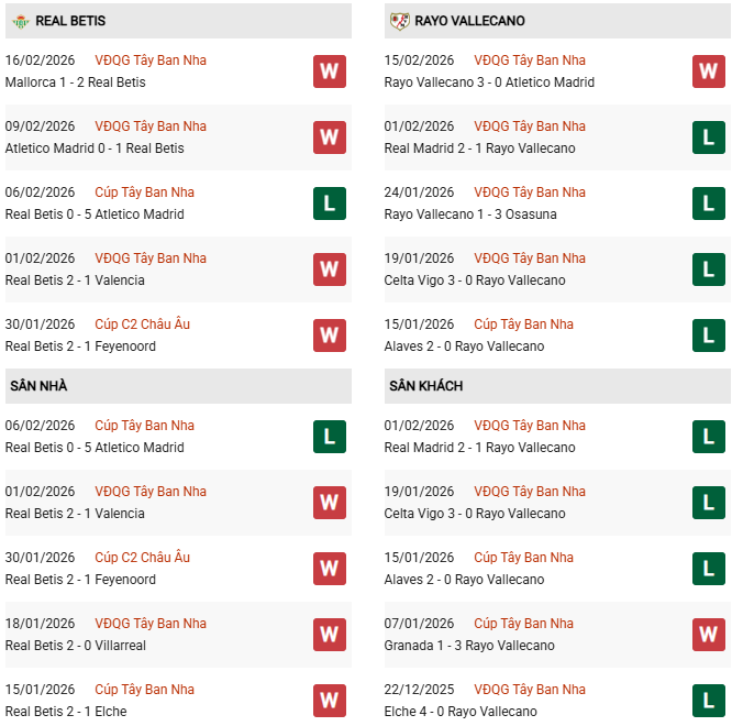 - Trên sân nhà, Real Betis thắng 4, thua 2 trước Vallecano.