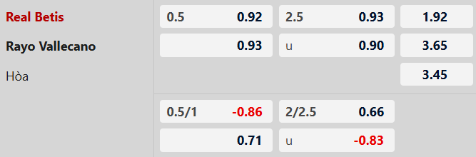 Thông tin tỷ lệ cược Real Betis vs Vallecano: