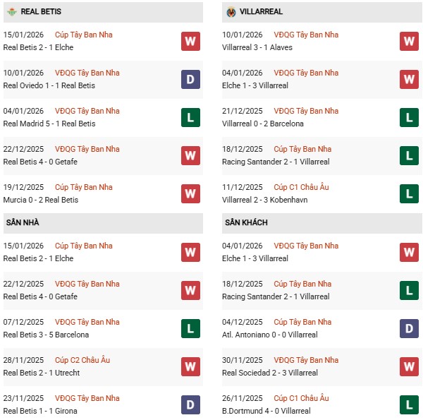 Trên sân nhà, Betis tiếp tục thể hiện bộ mặt đáng tin cậy khi thắng 6, hòa 2 và chỉ thua 2 trong 10 trận gần đây. Lối chơi của đội chủ sân Benito Villamarín vẫn dựa nhiều vào khả năng kiểm soát bóng và tổ chức tấn công biên, sẵn sàng chơi sòng phẳng trước các đối thủ mạnh. Dù vậy, việc phải đối đầu với một Villarreal đang nằm trong top 3 sẽ là thử thách không nhỏ cho tham vọng giữ vững vị trí trong nhóm dự cúp châu Âu.