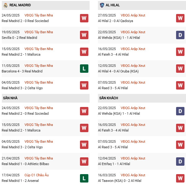 Thống kê phong độ Real Madrid vs Al Hilal: