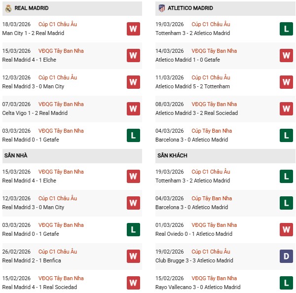Thống kê phong độ Real Madrid vs Atletico Madrid: