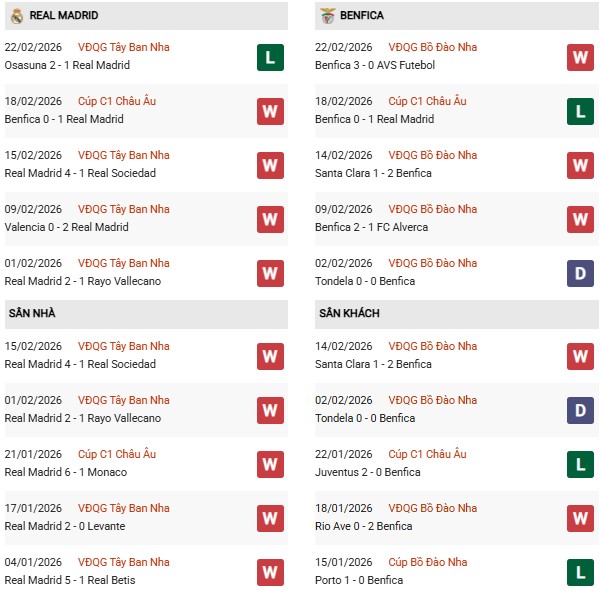 Thống kê phong độ Real Madrid vs Benfica: