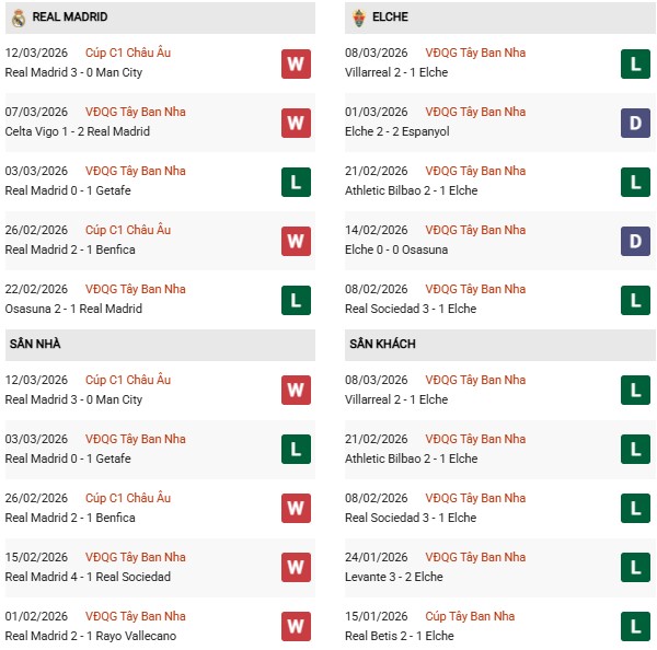 - Trên sân nhà, Real Madrid thắng 4, hòa 1 trước Elche.