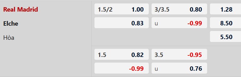 Thông tin tỷ lệ kèo bóng đá Real Madrid vs Elche: