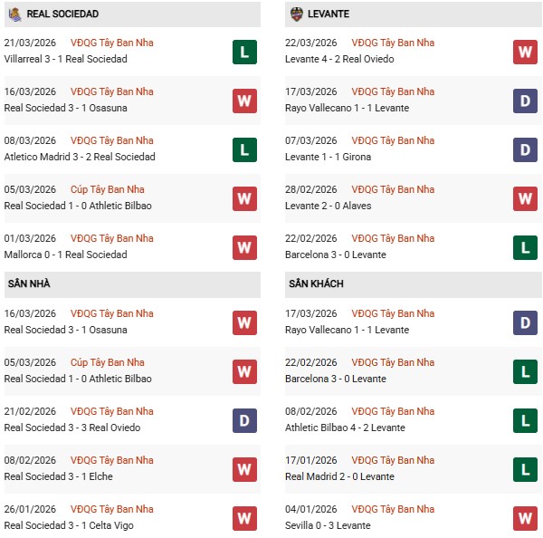 Thống kê phong độ Real Sociedad vs Levante: