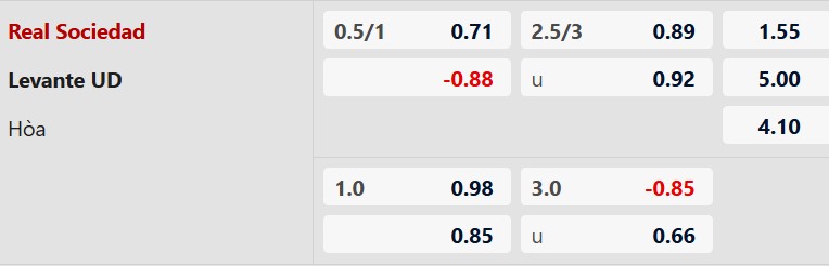 Thông tin tỷ lệ kèo Real Sociedad vs Levante: