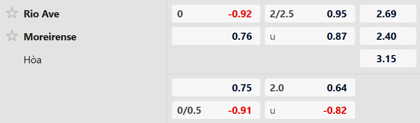 Hiệu suất ghi bàn: Rio Ave đang gặp vấn đề lớn trong khâu dứt điểm (không ghi bàn ở 4 trận gần nhất). Moreirense khi thi đấu xa nhà thường ưu tiên sự chắc chắn, với 5 trận khách gần nhất của họ đều có kết quả dưới 2.5 bàn thắng.