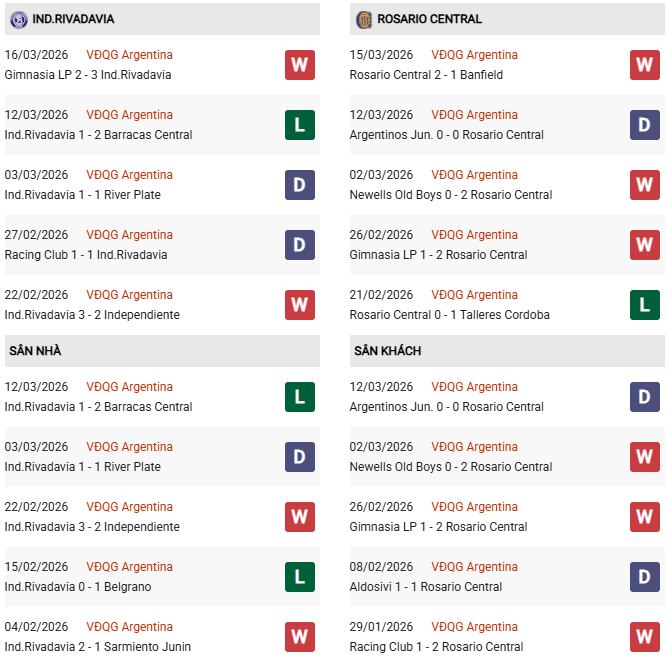 - Trên sân nhà, Rivadavia thắng 1, thua 2 trước Rosario Central.