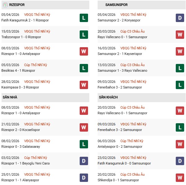- Trên sân nhà, Rizespor thắng 4, thua 3 trước Samsunspor.