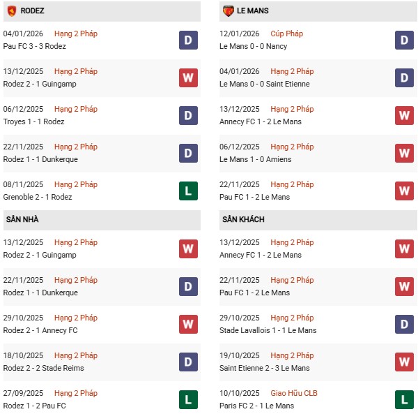 Thống kê phong độ Rodez vs Le Mans: