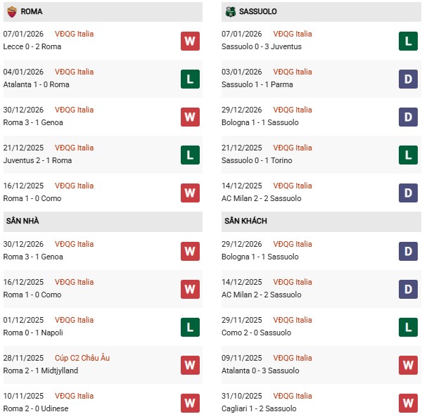 - Trên sân nhà, Roma thắng 5, thua 1 trước Sassuolo.