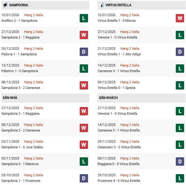 Sampdoria đang trải qua mùa giải đầy khó khăn khi chỉ xếp hạng 18 với 17 điểm sau 19 vòng đấu. Đội chủ sân Luigi Ferraris hiện kém chính Virtus Entella – đối thủ trực tiếp ở vị trí an toàn khoảng cách 2 điểm, vì vậy cuộc chạm trán này mang ý nghĩa như một “trận cầu 6 điểm” trong cuộc đua trụ hạng. Phong độ gần đây của Sampdoria vẫn thiếu sự ổn định khi thắng 3, hòa 2 và thua 5 trong 10 trận gần nhất, phản ánh rõ sự phập phù trong lối chơi cũng như khả năng duy trì thế trận.