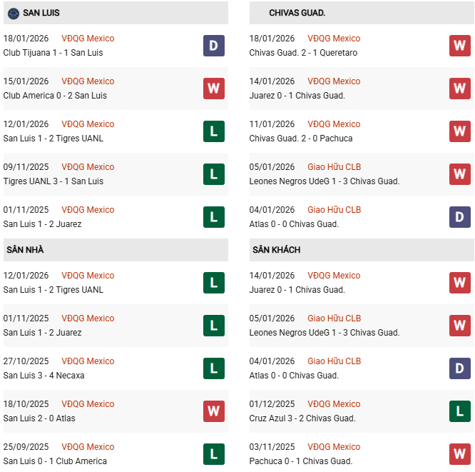 Thống kê phong độ San Luis vs Guadalajara Chivas: