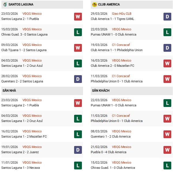 - Trên sân nhà, Santos Laguna thắng 2, thua 4 trước Club America.