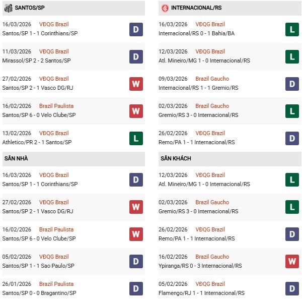 Đặc biệt, thành tích sân khách của Internacional là rất đáng báo động. Họ thua 2/3 chuyến hành quân gần nhất và không ghi nổi bàn thắng nào ở những trận đấu đó. Với bộ mặt như vậy, việc phải làm khách trên sân của Santos chắc chắn là thử thách không nhỏ.