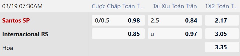 Thông tin tỷ lệ bóng đá Santos vs Internacional: