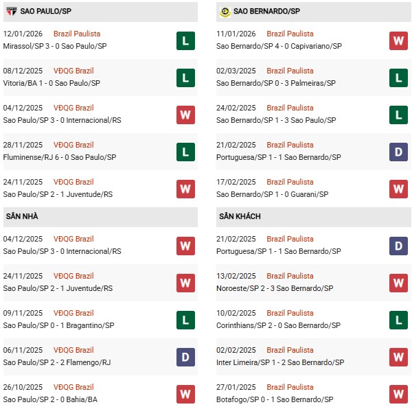 - Trên sân nhà, Sao Paulo thắng 2, thua 2 trước Sao Bernardo.