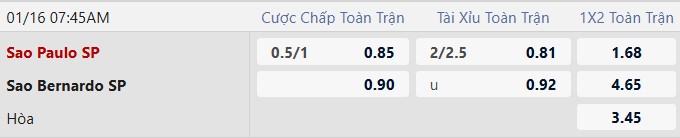 Thông tin tỷ lệ kèo Sao Paulo vs Sao Bernardo: