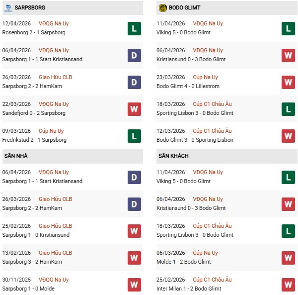 Thống kê phong độ Sarpsborg vs Bodo Glimt: