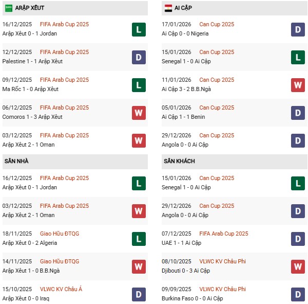 Thống kê phong độ Saudi Arabia vs Ai Cập: