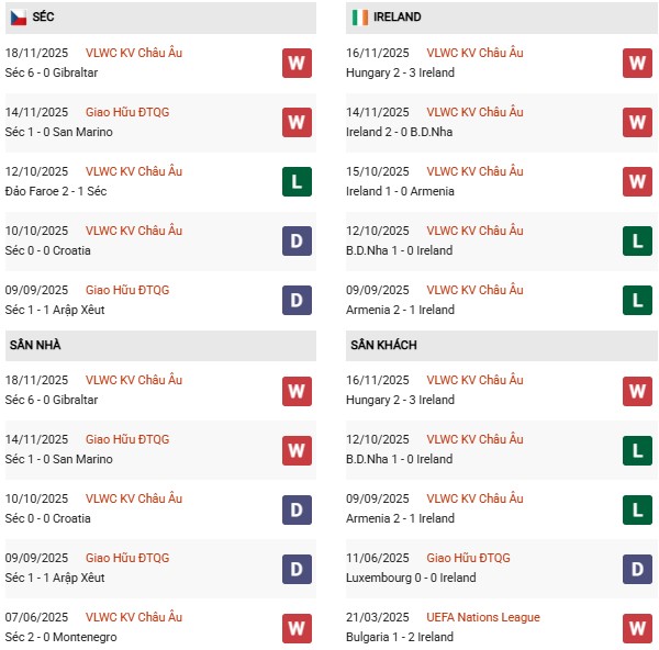 Đáng chú ý, Ireland thi đấu sân khách không quá tệ. Họ bất bại 3/5 chuyến hành quân gần nhất (thắng 2, hòa 1), trong đó có chiến thắng trên sân của Hungary và Bulgaria. Điều này giúp đội khách có thêm sự tự tin khi làm khách tại CH Séc.