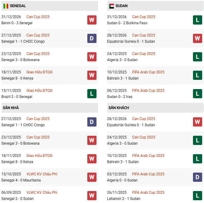 Thống kê phong độ Senegal vs Sudan: