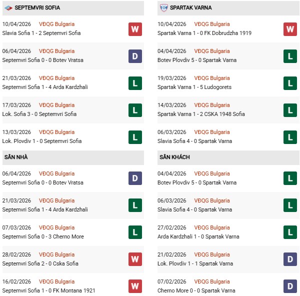 Ở phía đối diện, Spartak Varna cũng không khá hơn là bao. Họ thắng 1 và thua 4 trong 5 trận gần nhất, đáng chú ý là những thất bại đậm 0-5 trước Botev Plovdiv hay 0-4 trước Slavia Sofia. Dù vừa có chiến thắng 1-0 trước Dobrudzha, nhưng nhìn chung Spartak Varna vẫn thể hiện nhiều vấn đề, đặc biệt ở hàng thủ. Với 26 điểm và vị trí thứ 13, họ chỉ hơn chính Septemvri Sofia đúng 1 điểm.