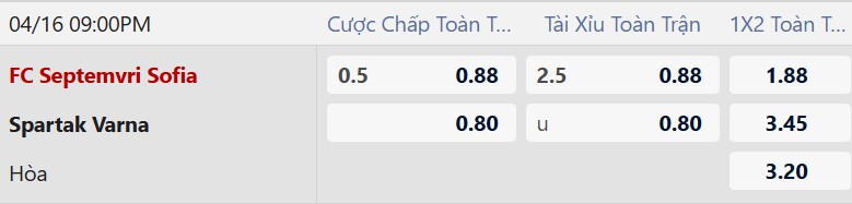 Septemvri Sofia chấp 1/2 bàn là mức kèo phản ánh lợi thế sân nhà. Trong bối cảnh Spartak Varna thi đấu sân khách kém cỏi, đội chủ nhà có nhiều cơ hội giành chiến thắng.