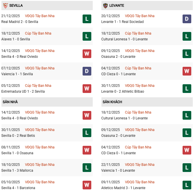 - Trên sân nhà, Sevilla thắng 7, thua 1 trước Levante.
