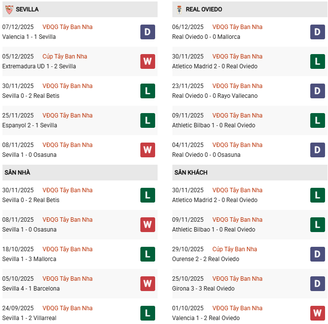 Thống kê phong độ Sevilla vs Oviedo: