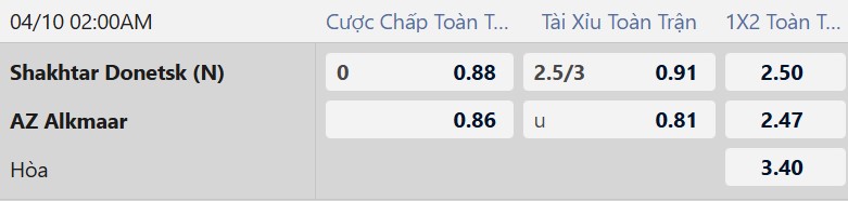 Thông tin tỷ lệ bóng đá Shakhtar Donetsk vs AZ Alkmaar: