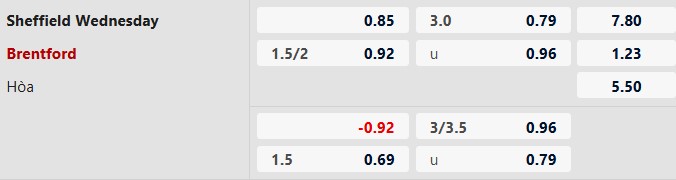 Thông tin tỷ lệ kèo Sheffield Wednesday vs Brentford: