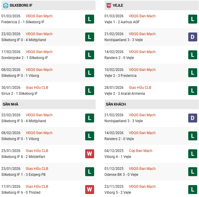 - Trên sân nhà, Silkeborg thắng 3, thua 4 trước Vejle.