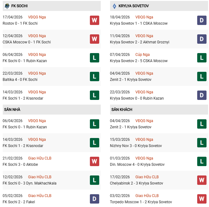 - Krylya Sovetov thắng 3/5 trận đối đầu vừa qua trước Sochi.