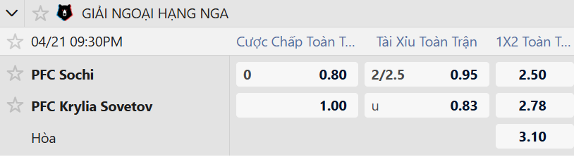 Thông tin tỷ lệ kèo Sochi vs Krylya Sovetov: