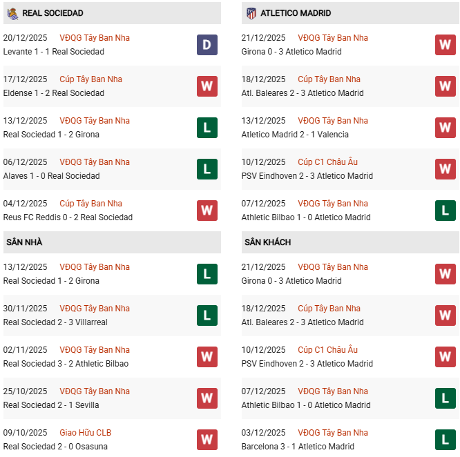 Trong khi đó, Sociedad gần đây thi đấu không tốt. Họ đang trải qua mạch 4 trận liền không thắng ở La Liga, bao gồm 3 thất bại. Trong trận thua sân nhà gần đây nhất của họ, thú vị thay, đối thủ đã chiến thắng ra về chính là Girona – kẻ vừa bị Atletico vùi dập 3 bàn không gỡ.