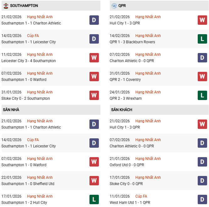 Thống kê phong độ Southampton vs QPR: